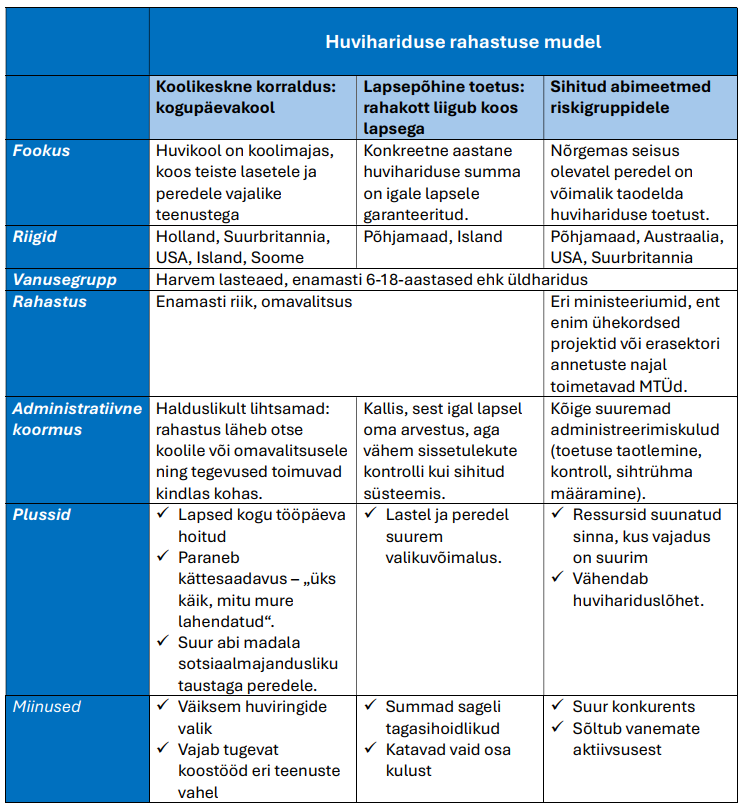 Koolikeskne korraldus on halduslikult kõige otstarbekam, kuid piirab laste ja perede võimalusi valida. Lapsepõhised toetused pakuvad suuremat vabadust, ent nõuavad ka märkimisväärselt rohkem ressursse. Sihitud skeemid aitavad leevendada ebavõrdsust, kuid toovad vältimatult kaasa keeruka halduskoormuse. Ühine joon kõigi nende lahenduste puhul on aga see, et tõhusaim rahastusmudel sünnib siis, kui see lähtub laste tegelikest vajadustest ja osalusvõimalustest.