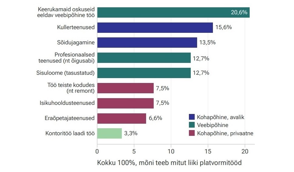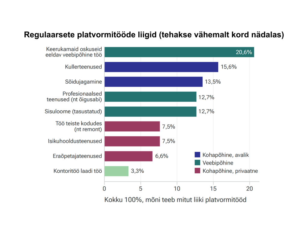 Kohapõhiseid töid, nagu kullerteenused ja sõidujagamine teeb regulaarselt ligi kolmandik küsitletud platvormitöö tegijatest. Seejuures selgus murettekitava trendina, et neist paljud töötavad enam kui 50 tundi nädalas, mis koormab tervist ja piirab õppimisvõimalusi.